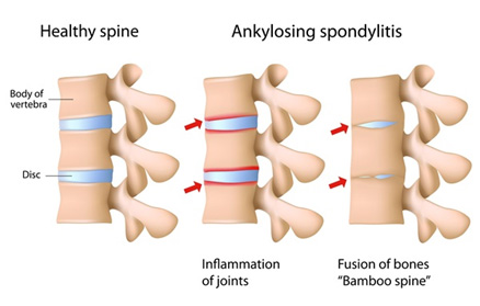 Reasons for ankylosing spondylitis are unknown but it may be related genetic factor. Inflammation of joints due to ankylosing spondylitis cause bony growth and fusion of vertebral joints. This causes restriction of movements and restricted breathing. It may also cause inflammation of tendons like Achilles tendon at ankle. Diagnosis of ankylosing spondylitis is by MRI /CAT scan.