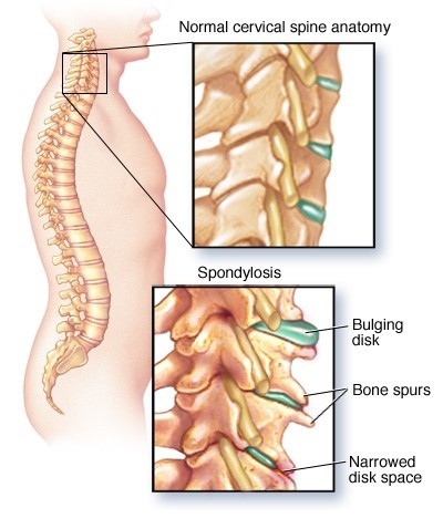 Cervical spine: Degenerative changes or injuries to the cervical spine, including herniated discs, osteoarthritis, or spinal stenosis can be present. Most of the time such patients do not have any complaints. However, those with complaints may need treatment for cervical radiculopathy.