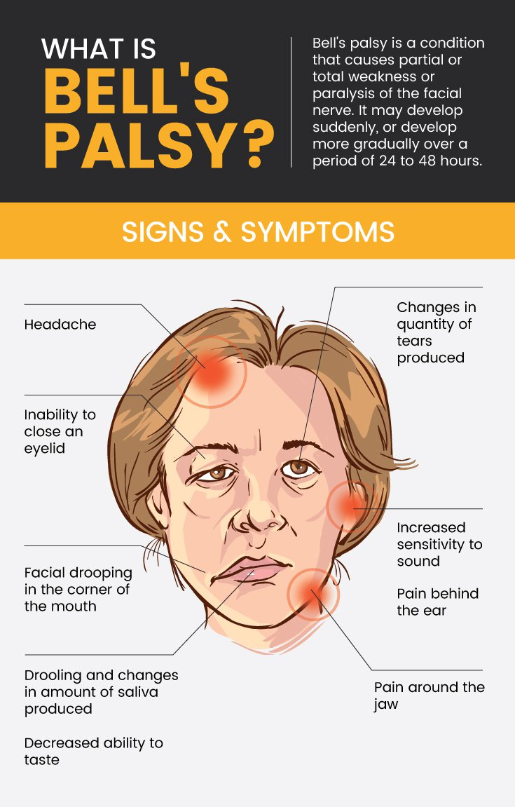 Facial palsy or Bell's palsy symptoms include sudden weakness or paralysis on one side of your face. Facial nerve that control muscles in your face becomes injured or stops working properly. Bell's palsy is a neurological disorder that causes paralysis or weakness on one side of the face. A drooping eyebrow and mouth are also seen in face paralysis symptoms. Bell's palsy causes are not known. Other facial palsy causes can be trauma, tumour, or viruses. It can also lead to complications such as difficulty in closing the eye on the affected side, resulting in dryness and potential corneal damage.